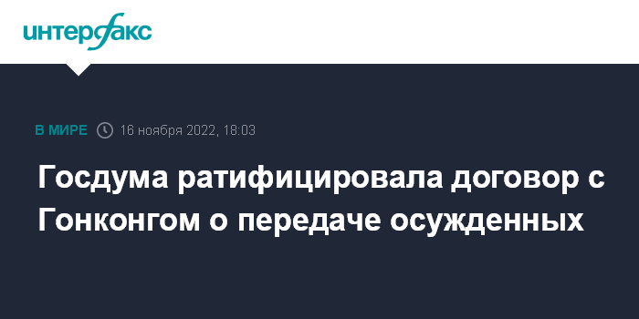 Москва. 16 ноября. INTERFAX.RU - Госдума ратифицировала договор между Россией и специальным административным районом Гонконг Китайской народной республики о передаче осужденных.