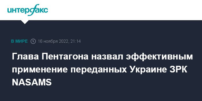 Москва. 16 ноября. INTERFAX.RU - Зенитные ракетные комплексы NASAMS, поставленные Украине западными странами, уже применяются, заявил глава Пентагона Ллойд Остин.