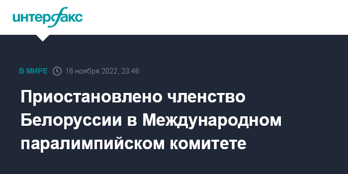 Москва. 16 ноября. INTERFAX.RU - Международный паралимпийский комитет (МПК) решил приостановить членство Белоруссии в организации, сообщила пресс-служба по итогам внеочередного заседания в Берлине в среду.