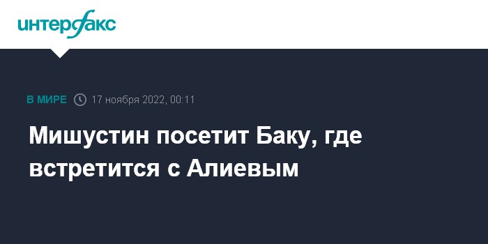 Как сообщили в пресс-службе правительства РФ, Мишустин встретится с президентом Азербайджана Ильхамом Алиевым, проведёт переговоры с премьером Азербайджана Али Асадовым.