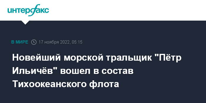 Москва. 17 ноября. INTERFAX.RU - На современном морском тральщике "Пётр Ильичёв" состоялась торжественная церемония поднятия Андреевского флага. Приказом главнокомандующего Военно-Морским Флотом адмирала Николая Евменова корабль включён в боевой состав Тихоокеанского флота, сообщает в четверг Минобороны России.