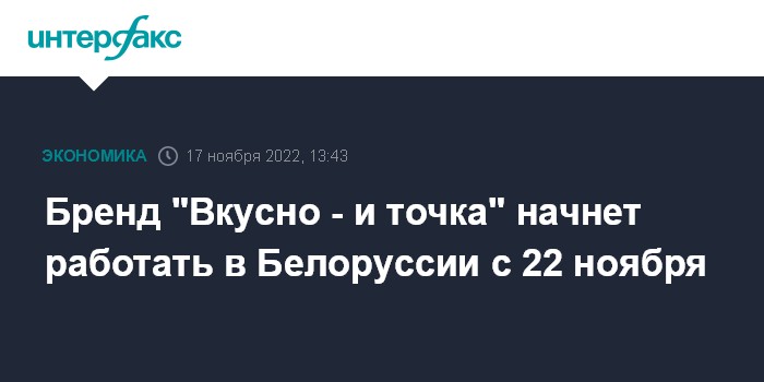 Москва. 17 ноября. INTERFAX.RU - Сеть ресторанов бренда McDonald's в Белоруссии с 22 ноября начнет работу под новым брендом "Вкусно - и точка", сообщила компания в соцсетях.