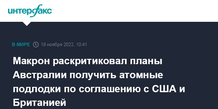 "Макрон сказал, что сделка по ядерным подлодкам, известная как AUKUS, стала мощным сигналом бедствия для Франции, и что Австралии придется положиться на ненадежные линии поставок в военной сфере", - передает агентство.