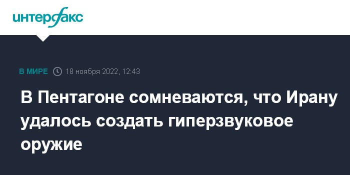 Москва. 18 ноября. INTERFAX.RU - США не уверены, что Иран смог сконструировать свою первую гиперзвуковую ракету, заявила пресс-секретарь Пентагона Сабрина Сингх.