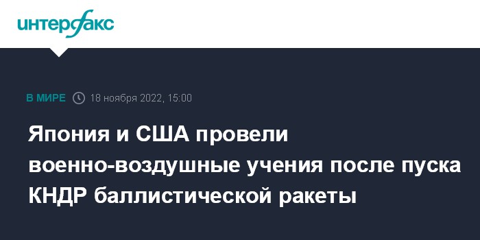 Москва. 18 ноября. INTERFAX.RU - Воздушные Силы самообороны Японии и ВВС США в пятницу провели над Японским морем совместные учения - после испытания КНДР баллистической ракеты дальнего действия, сообщает NHK.