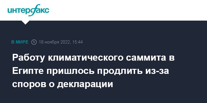 Москва. 18 ноября. INTERFAX.RU - Конференция ООН по климату COP27 в Шарм-эль-Шейхе, которая должна была завершиться в пятницу, продолжит работу в субботу, покольку ее участники пока не смогли преодолеть разногласия и согласовать итоговый документ. О продлении мероприятия сообщает Ahram Online.