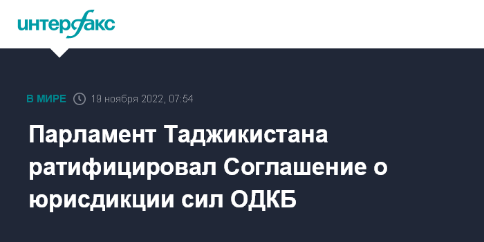 Москва. 19 ноября. INTERFAX.RU - Маджлиси Намояндагон (нижняя палата парламента) Таджикистана ратифицировала Соглашение по вопросам юрисдикции и оказания правовой помощи по делам, связанным с временным пребыванием сил и средств системы коллективной безопасности на территории государств-членов Организации Договора о коллективной безопасности (ОДКБ).