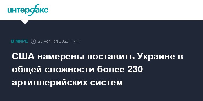 Москва. 20 ноября. INTERFAX.RU - Программа помощи Соединенных Штатов Украине включает, в частности, поставку в общей сложности 236 артиллерийских систем, следует из данных Госдепа, размещенных на его сайте.