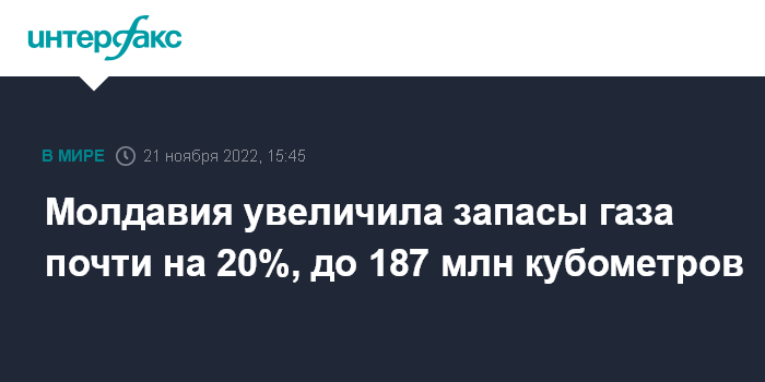 Москва. 21 ноября. INTERFAX.RU - Молдавия на прошлой неделе закупила 30 млн кубометров газа, доведя общие запасы "голубого топлива" до 187 млн кубометров, сообщил вице-премьер, министр инфраструктуры и регионального развития Молдавии Андрей Спыну.
