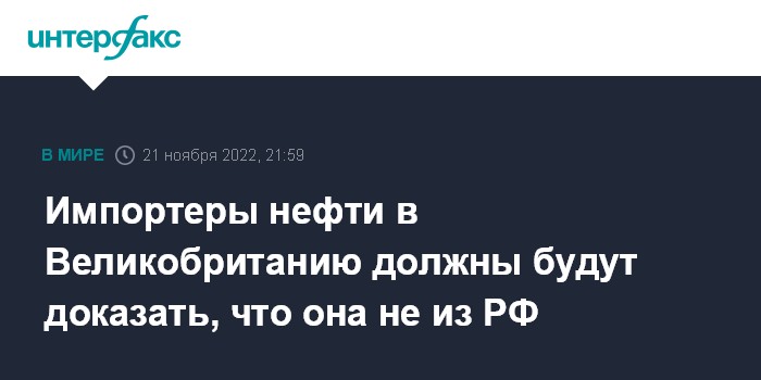 Москва. 21 ноября. INTERFAX.RU - Импортеры нефти и нефтепродуктов в Великобританию должны будут готовы документально доказать, что товар не российского происхождения, иначе столкнутся с проблемами – вплоть до конфискации.