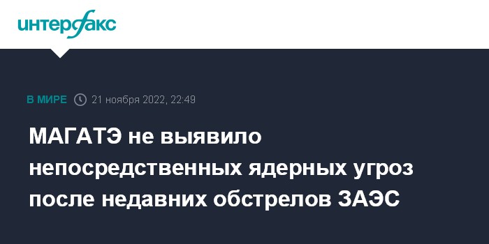 Москва. 21 ноября. INTERFAX.RU - Эксперты МАГАТЭ по итогам осмотра Запорожской АЭС (ЗАЭС) после недавних обстрелов не зарегистрировали прямой угрозы ядерной безопасности, говорится в заявлении главы МАГАТЭ Рафаэля Гросси.