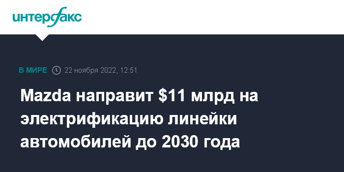 Москва. 22 ноября. INTERFAX.RU - Японский автопроизводитель Mazda Motor Corp планирует потратить порядка 1,5 трлн иен ($11 млрд) на электрификацию линейки автомобилей до 2030 года.