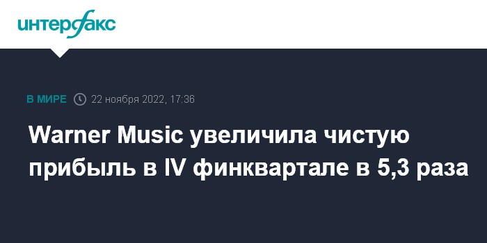 Москва. 22 ноября. INTERFAX.RU - Одна из ведущих звукозаписывающих компаний мира Warner Music Group Corp (WMG) в четвертом финансовом квартале увеличила чистую прибыль в 5,3 раза, при этом показатель в расчете на акцию превысил ожидания аналитиков.