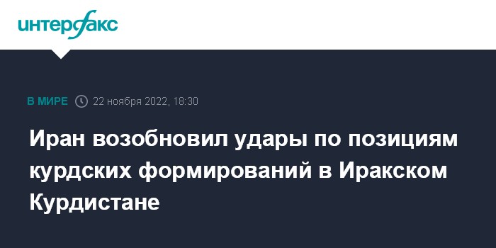Москва. 22 ноября. INTERFAX.RU - Корпус Стражей Исламской революции (КСИР) Ирана во вторник вновь начал наносить удары по позициям курдских вооруженных групп в Иракском Курдистане, сообщает "Тасним".