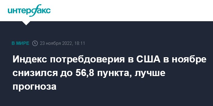 Москва. 23 ноября. INTERFAX.RU - Индекс потребительского доверия в США в ноябре понизился до 56,8 пункта с 59,9 пункта месяцем ранее. Об этом свидетельствуют окончательные данные Мичиганского университета, который рассчитывает этот показатель.