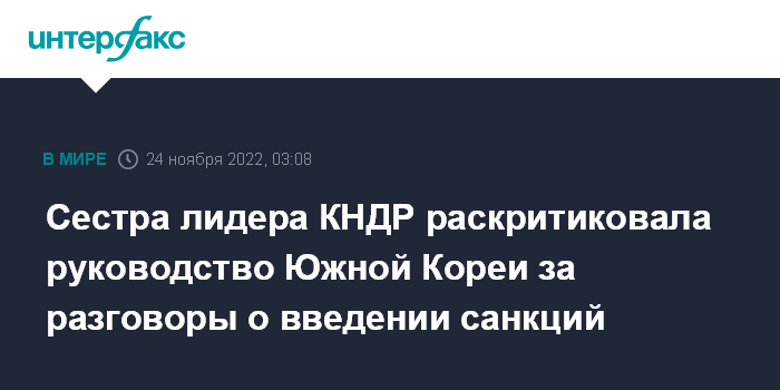 Москва. 24 ноября. INTERFAX.RU - Сестра северокорейского лидера Ким Чен Ына заместитель заведующего отделом ЦК ТПК Ким Е Чжон раскритиковала администрацию президента Южной Кореи Юн Сок Еля за то, что она грозится ввести санкции в отношении КНДР, сообщает ЦТАК.