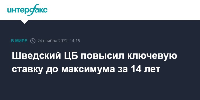 Москва. 24 ноября. INTERFAX.RU - Центральный банк Швеции (Riksbank) в четверг увеличил ключевую процентную ставку на 75 базисных пунктов - до 2,5% годовых с 1,75%.