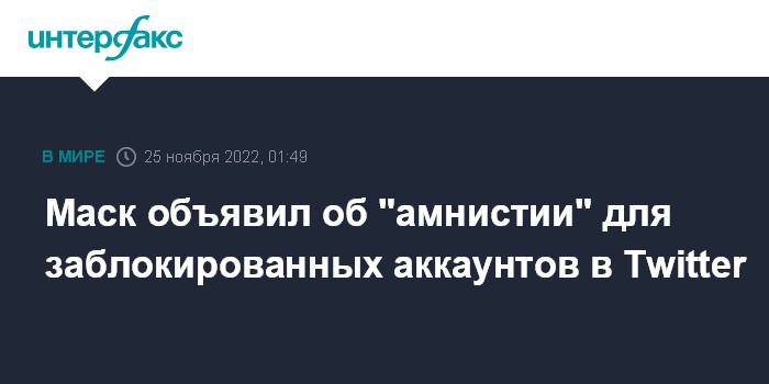 Агентство отмечает, что это было сделано после публикации в твиттере Маска опроса о том, следует ли "амнистировать" заблокированных пользователей, которые "не нарушали закон и не занимались вопиющим спамом". 72% из более чем 3 млн проголосовавших высказались за "амнистию".