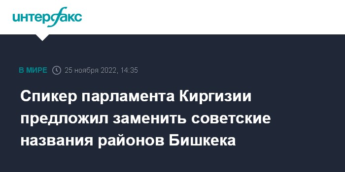 Москва. 25 ноября. INTERFAX.RU - Спикер парламента Киргизии Нурланбек Шакиев предложил в срочном порядке переименовать районы Бишкека, убрав советские названия и заменив их названиями на киргизском языке. Он заявил об этом на съезде первого Народного Курултая.