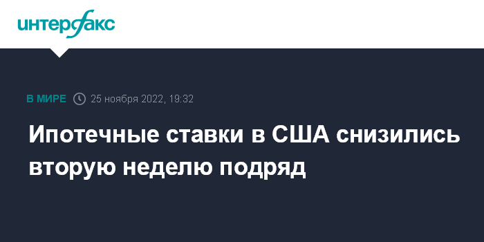 Москва. 25 ноября. INTERFAX.RU - Ставки по ипотечным кредитам в США снизились по итогам второй недели подряд в ожидании замедления темпов роста потребительских цен, сообщает CNN.