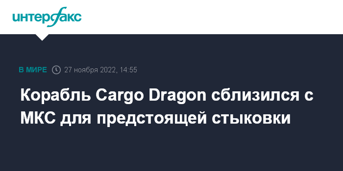 Москва. 27 ноября. INTERFAX.RU - Многоразовый грузовой космический корабль Cargo Dragon компании SpaceX, выведенный накануне на орбиту Земли, в воскресенье сблизился с Международной космической станцией (МКС) для предстоящей стыковки, сообщило НАСА.