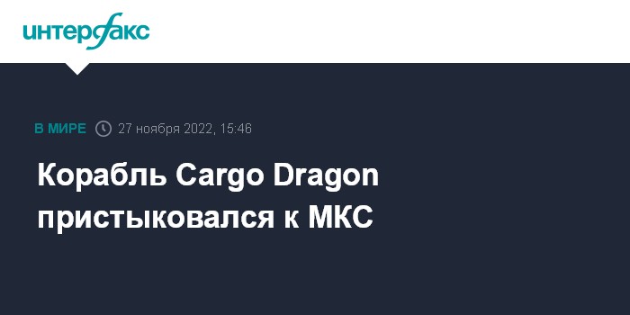 Москва. 27 ноября. INTERFAX.RU - Многоразовый грузовой космический корабль Cargo Dragon американской компании SpaceX в воскресенье совершил успешную автономную стыковку с Международной космической станцией (МКС), сообщило Национальное управление США по аэронавтике и исследованию космического пространства (НАСА).