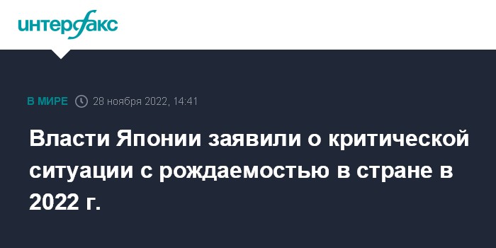 Москва. 28 ноября. INTERFAX.RU - Уровень рождаемости в Японии в 2022 году грозит достичь новых минимальных показателей, заявил генсек японского кабмина Хирокадзу Мацуно.