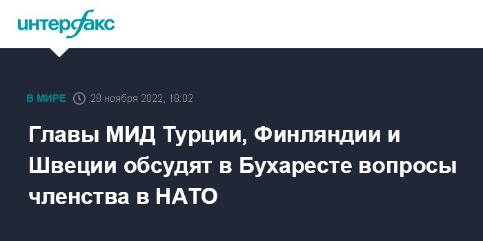 Москва. 28 ноября. INTERFAX.RU - Министры иностранных дел Турции, Финляндии и Швеции во вторник проведут в столице Румынии Бухаресте трехстороннюю встречу по вопросу членства Финляндии и Швеции в НАТО.