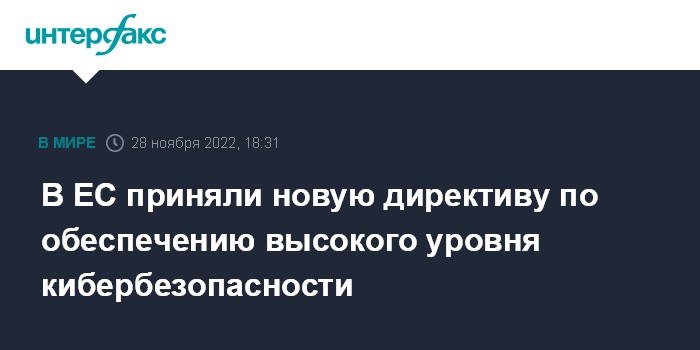 Москва. 28 ноября. INTERFAX.RU - Совет ЕС утвердил в понедельник директиву о поддержании высокого уровня кибербезопасности по всему союзу "для дальнейшего повышения устойчивости и потенциала реагирования на инциденты как государственного и частного секторов, так и ЕС в целом".