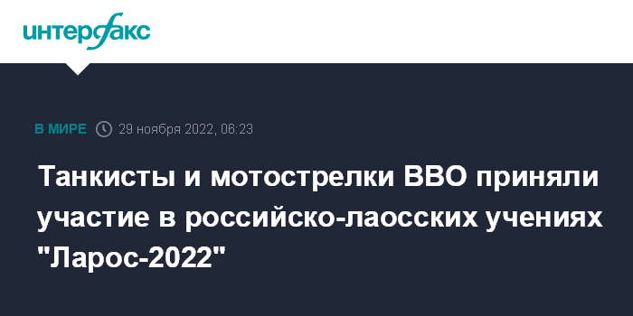 Москва. 29 ноября. INTERFAX.RU - Военнослужащие танковых, мотострелковых подразделений и подразделений усиления Восточного военного округа принимают участие в совместных российско-лаосских учениях "Ларос-2022", которые стартовали в Лаосской Народно-Демократической Республике под лозунгом "Плечом к плечу за мир и безопасность", сообщило во вторник Минобороны России.
