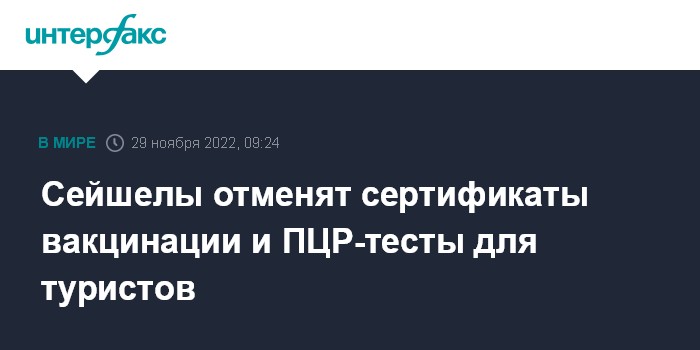 "Министерство здравоохранения Сейшельских островов с 1 декабря отменяет требования о предъявлении сертификатов вакцинации либо ПЦР-тестов при въезде в страну. Тем не менее, путешественникам все равно понадобится заполнять онлайн-форму разрешения на въезд в электронной пограничной системе (Seychelles Electronic Border System). Прежде эта информация предъявлялась по прибытии в аэропорту в бумажной форме, а теперь ее необходимо предоставлять онлайн. При заполнении формы путешественникам также необходимо предоставить отсканированную копию своего паспорта, которую можно загрузить через веб-сайт системы или приложение", - сообщает Сейшельское агентство новостей.