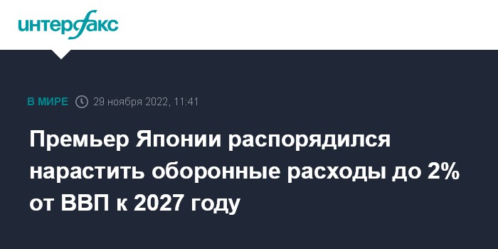 "Премьер-министр Японии Фумио Кисида дал указание главам Минобороны и Минфина нарастить оборонные расходы до 2% от ВВП к 2027 году. Этой цели давно добивалась правящая партия Японии, но Кисида впервые говорил о ней как о конкретном направлении бюджетной политики", - отмечает издание.