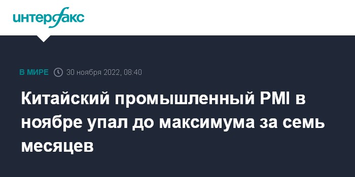 Москва. 30 ноября. INTERFAX.RU - Индекс менеджеров по закупкам (PMI) в перерабатывающей промышленности Китая опустился в ноябре до 48 пунктов с 49,2 пункта месяцем ранее – максимальными темпами с апреля. Об этом свидетельствуют данные Государственного статистического управления КНР (ГСУ).