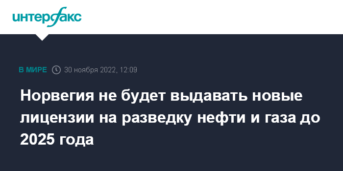 Москва. 30 ноября. INTERFAX.RU - Норвегия приостанавливает выдачу новых лицензий на разведку нефти и газа еще на три года – до 2025 года, сообщает Financial Times.