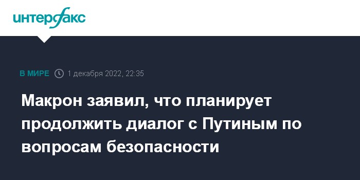 Москва. 1 декабря. INTERFAX.RU - Президент Франции Эммануэль Макрон заявил в четверг, что в ближайшее время планирует продолжить обсуждение с президентом России Владимиром Путиным вопросы безопасности.