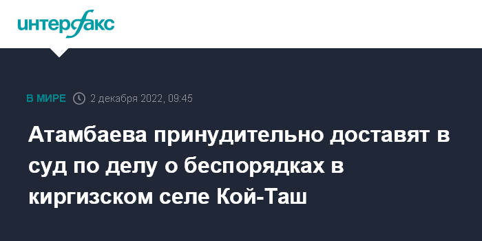 Москва. 2 декабря. INTERFAX.RU - Суд в Бишкеке принял решение о принудительном приводе в суд экс-президента Киргизии Алмазбека Атамбаева по делу о беспорядках в селе Кой-Таш в 2019 году, сообщила в пятницу заместитель председателя Социал-демократической партии Киргизии (СДПК) Кундуз Жолдубаева.