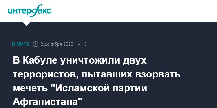 Москва. 2 декабря. INTERFAX.RU - Двое террористов-смертников были убиты в пятницу в Кабуле при попытке нападения на мечеть в штаб-квартире "Хизб-э-Ислами" (Исламской партии Афганистана), сообщает информационное агентство Aamaj News.