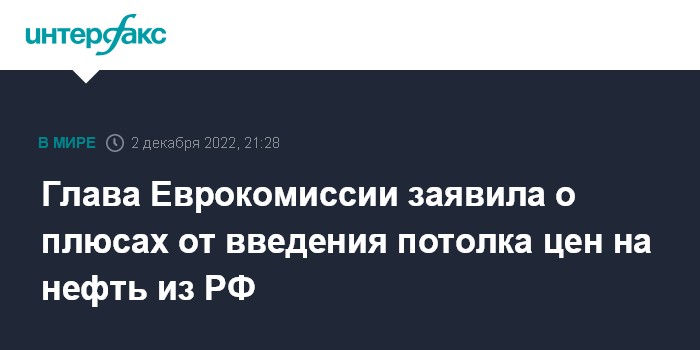 Москва. 2 декабря. INTERFAX.RU - Соглашение ЕС по потолку цен на нефть из России поможет стабилизировать мировые цены на энергоносители, сократит доходы РФ, написала в твиттере председатель Еврокомиссии Урсула фон дер Ляйен.