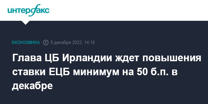 Москва. 5 декабря. INTERFAX.RU - Европейскому центральному банку необходимо поднять процентные ставки в декабре по крайней мере на 50 базисных пунктов, считает член совета управляющих ЕЦБ и глава Центрального банка Ирландии Габриэль Махлуф.