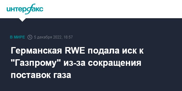 Москва. 5 декабря. INTERFAX.RU - Германская RWE инициировала арбитражное разбирательство против "Газпрома" в связи с недопоставками газа, пишет Handelsblatt.