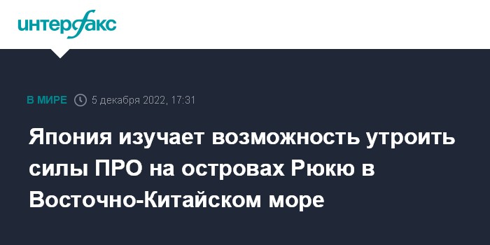 Москва. 5 декабря. INTERFAX.RU - Власти Японии рассматривают вариант почти в три раза нарастить силы ПРО на островах Рюкю в Восточно-Китайском море для перехвата баллистических ракет. Об этом сообщает в понедельник Kyodo со ссылкой на проект соответствующего плана.