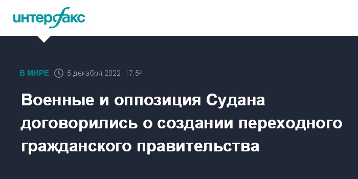 Москва. 5 декабря. INTERFAX.RU - Суданские военные и основное продемократическое объединение в понедельник заключили соглашение о формировании в стране гражданского переходного правительства, передает Associated Press (AP).