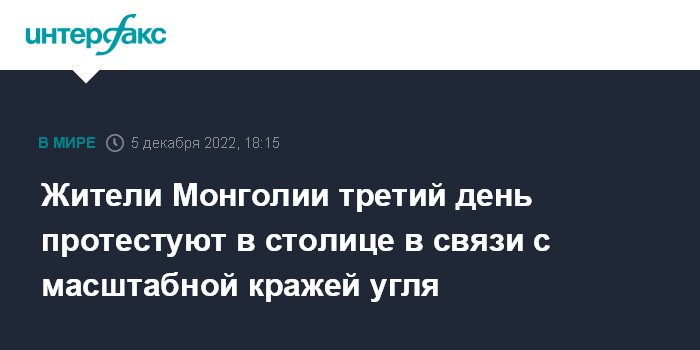 Москва. 5 декабря. INTERFAX.RU - В столице Монголии Улан-Баторе третий день подряд проходят акции протеста в связи с масштабным хищением угля, передают в понедельник местные СМИ.