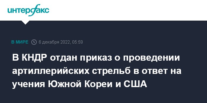 Москва. 6 декабря. INTERFAX.RU - Генеральный штаб армии КНДР во вторник отдал приказ об артиллерийских стрельбах в море в ответ на учения между Южной Кореей и США вблизи межкорейской границы.