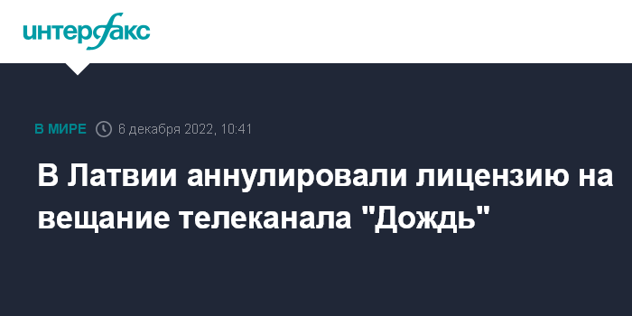 Москва. 6 декабря. INTERFAX.RU - Национальный совет Латвии по электронным СМИ (НСЭСМИ) аннулировал лицензию на вещание в республике российского телеканала "Дождь" (признан в России иноагентом), объявил председатель НСЭСМИ Ивар Аболиньш. Об этом сообщает BNS.