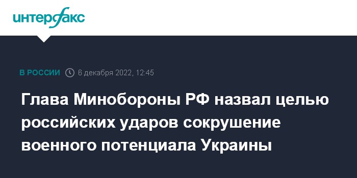 Москва. 6 декабря. INTERFAX.RU - Министр обороны РФ Сергей Шойгу заявил, что РФ наносит массированные ракетные удары по различным объектам на Украине для сокрушения военного потенциала этой страны.