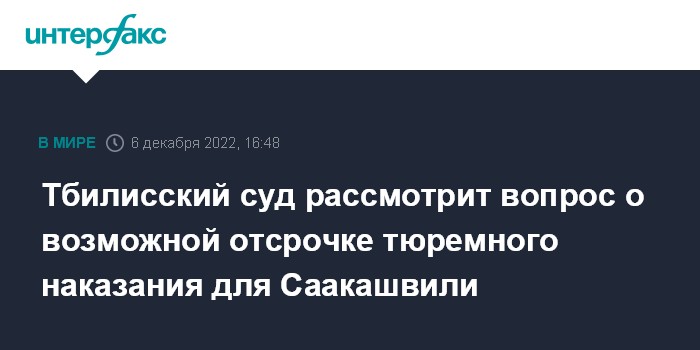 Москва. 6 декабря. INTERFAX.RU - Суд в Тбилиси решит вопрос об отсрочке тюремного наказания экс-президенту Грузии Михаилу Саакашвили, сообщил во вторник журналистам адвокат Илиа Ломия.