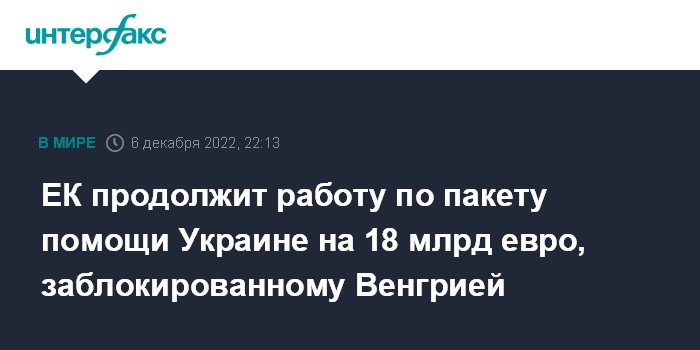 Ранее во вторник европейские СМИ сообщили, что Венгрия воспользовалась правом вето и заблокировала пакет макрофинансовой помощи Евросоюза на 18 млрд евро, предложенный Еврокомиссией для Украины на 2023 год.