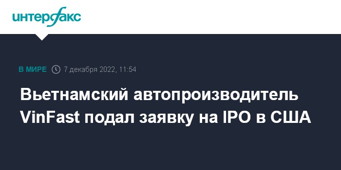 Москва. 7 декабря. INTERFAX.RU - Вьетнамский производитель электромобилей, скутеров и автобусов VinFast Auto Ltd подал заявку на проведение IPO в США.