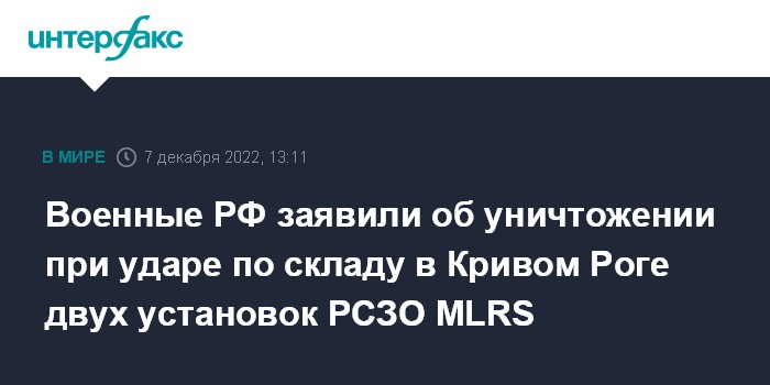 Москва. 7 декабря. INTERFAX.RU - Ударом по складу в одном из цехов комбината ArcelorMittal в Кривом Роге уничтожены две пусковые установки реактивной системы залпового огня (РСЗО) MLRS и более 70 ракет от HIMARS, заявил официальный представитель Минобороны РФ Игорь Конашенков.